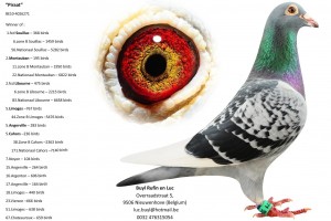 100.National St.Vincent—10020 birds (2005) – BARCELONA START 2013. – “Matador” won 2. International against 25294 pigeons, loose 1. international from “New Laureaat” for 0,44 m/min !!!!!! “Matador” je izgubio 1. mjesto Internacionalno od “New Laueraata” za 0,44 m/min !!!!!!